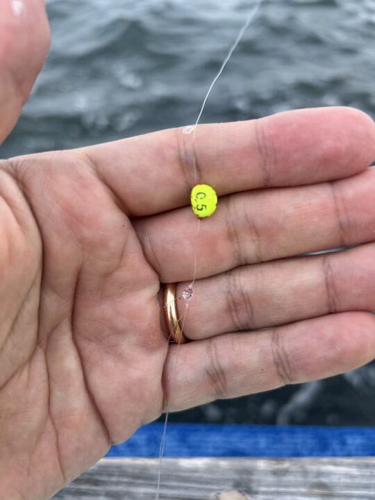 そこで、上針のエダスが分かれる部分に0.5号の中オモリを打てば、針が沈んでくれるし、シェイクした時に上針が良い感じに踊ってくれるのではないか?との期待だ。